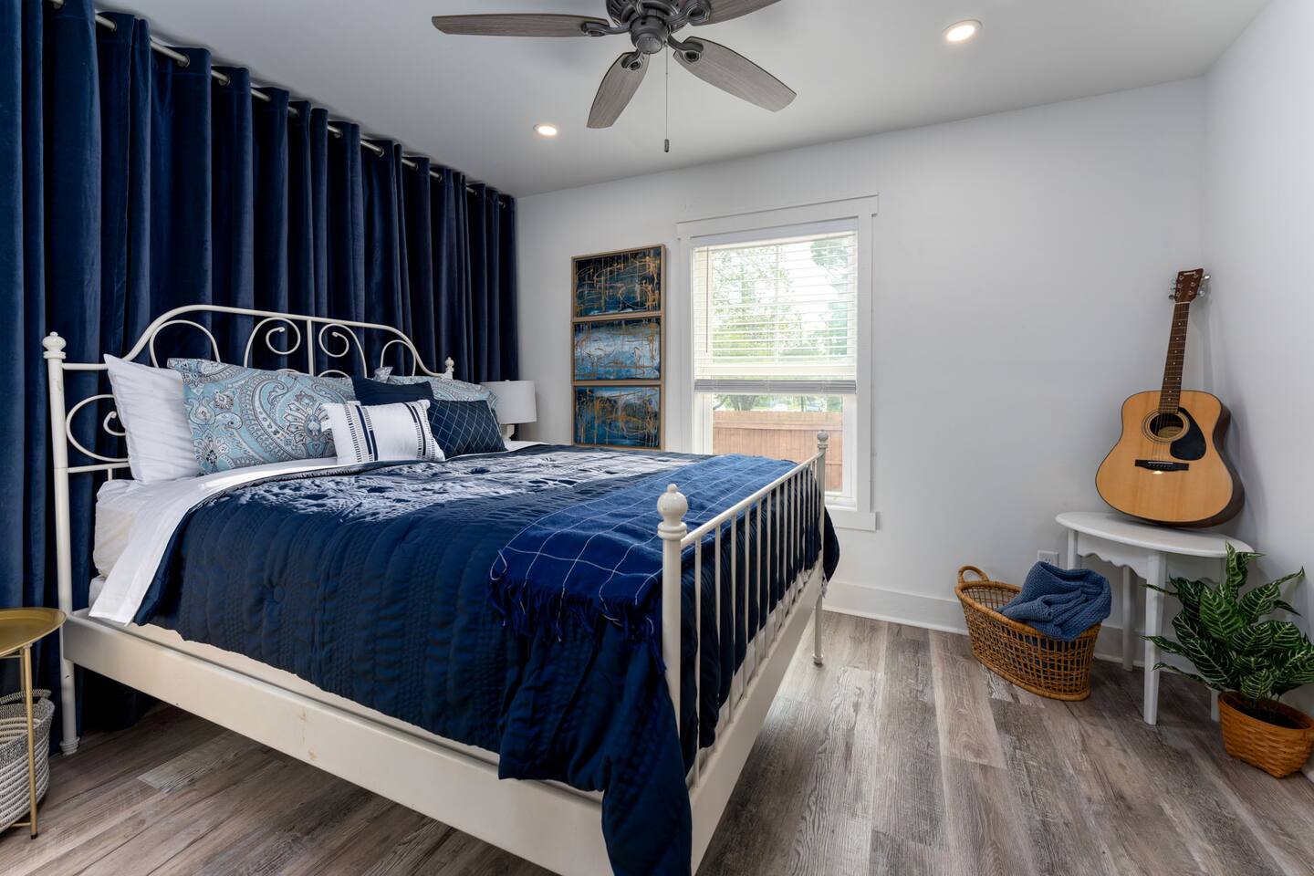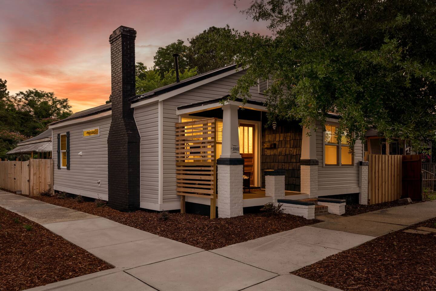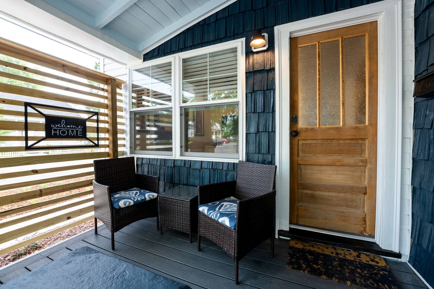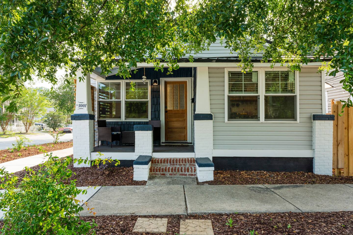 ➝ 2 bedrooms | 2 bathrooms | Sleeps 4 ➝ Stylish interior with modern and retro design elements ➝ Smart TV with soundbar & high-speed Wi-Fi ➝ Fully equipped kitchen with full-size appliances ➝ Private fenced backyard | Pet-friendly ➝ Free street parking | Walkable neighborhood Bedroom 1 Queen bed with plush bedding and calming décor. Ideal for restful nights and quiet mornings. Bedroom 2 Queen bed with cozy finishes and natural light. A comfortable setup for couples or friends traveling together. Bathroom 1 Walk-in shower with fresh towels and essentials. Designed for quick mornings or relaxing evening routines. Bathroom 2 Tub/shower combo with clean, modern finishes. A convenient option for longer stays or shared use. Living Room Comfortable seating and a Smart TV with soundbar for streaming and downtime. A cozy space to unwind after a day downtown. Kitchen Fully equipped with stove, oven, refrigerator, and cookware. Perfect for easy breakfasts, home-cooked meals, or takeout nights in. Outdoor Space ➝ Private fenced backyard for relaxing or pet play ➝ Front porch seating to enjoy the neighborhood atmosphere Location & Access ➝ 10-min walk to Live Oak Bank Pavilion ➝ 15-min walk to downtown Wilmington & Riverwalk ➝ 8-min drive to Wilmington International Airport ➝ 20-min drive to Wrightsville Beach ➝ Minutes to the Wilmington Convention Center