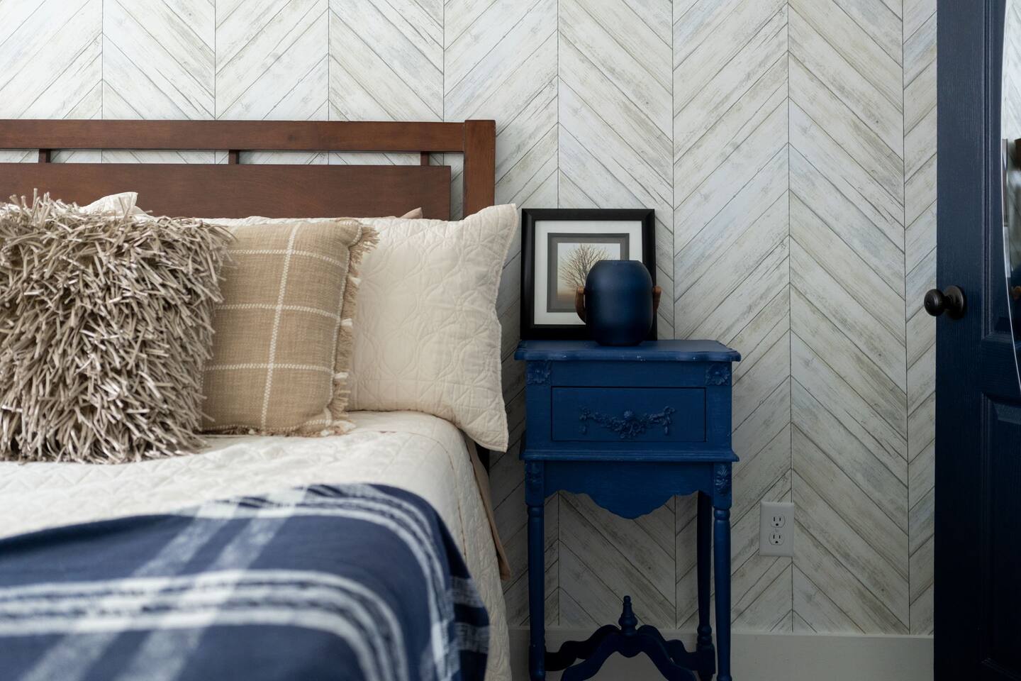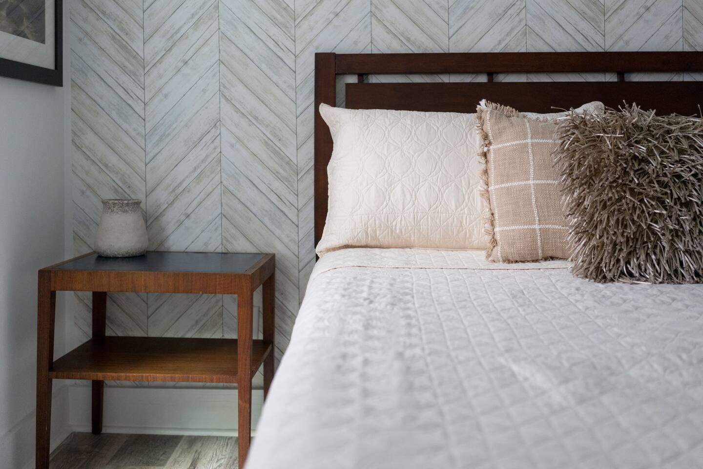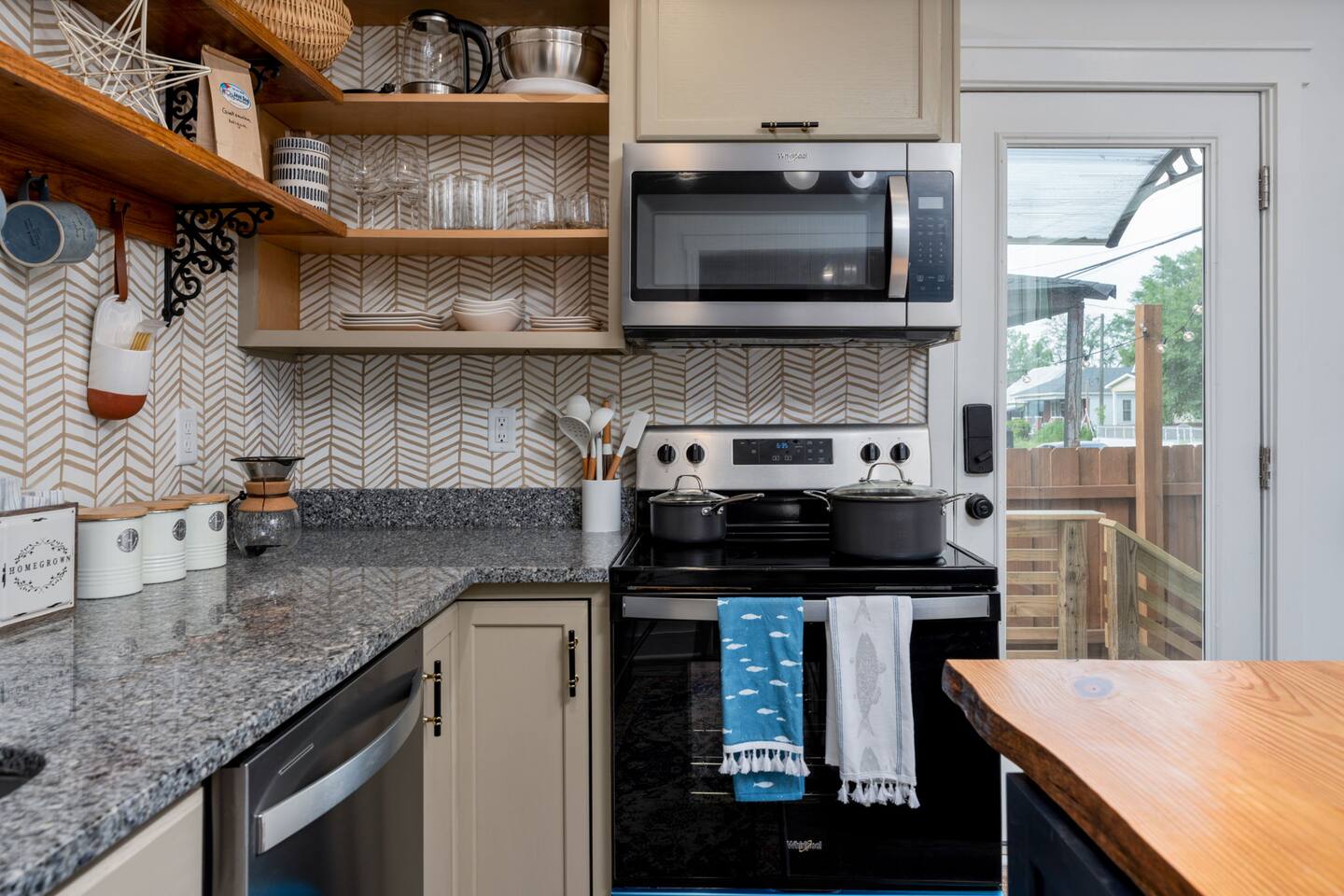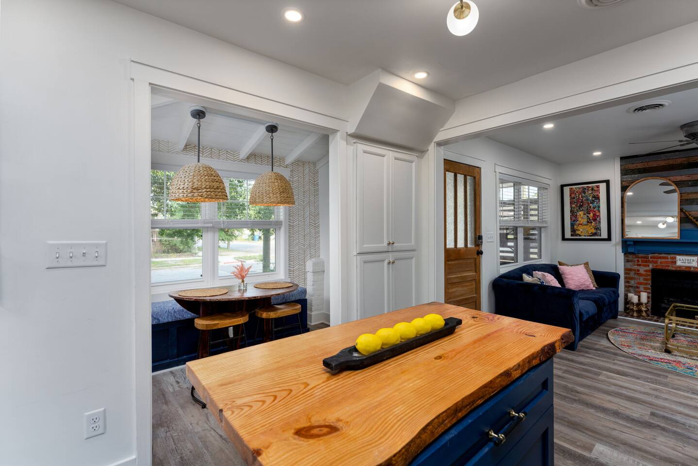 ➝ 2 bedrooms | 2 bathrooms | Sleeps 4 ➝ Stylish interior with modern and retro design elements ➝ Smart TV with soundbar & high-speed Wi-Fi ➝ Fully equipped kitchen with full-size appliances ➝ Private fenced backyard | Pet-friendly ➝ Free street parking | Walkable neighborhood Bedroom 1 Queen bed with plush bedding and calming décor. Ideal for restful nights and quiet mornings. Bedroom 2 Queen bed with cozy finishes and natural light. A comfortable setup for couples or friends traveling together. Bathroom 1 Walk-in shower with fresh towels and essentials. Designed for quick mornings or relaxing evening routines. Bathroom 2 Tub/shower combo with clean, modern finishes. A convenient option for longer stays or shared use. Living Room Comfortable seating and a Smart TV with soundbar for streaming and downtime. A cozy space to unwind after a day downtown. Kitchen Fully equipped with stove, oven, refrigerator, and cookware. Perfect for easy breakfasts, home-cooked meals, or takeout nights in. Outdoor Space ➝ Private fenced backyard for relaxing or pet play ➝ Front porch seating to enjoy the neighborhood atmosphere Location & Access ➝ 10-min walk to Live Oak Bank Pavilion ➝ 15-min walk to downtown Wilmington & Riverwalk ➝ 8-min drive to Wilmington International Airport ➝ 20-min drive to Wrightsville Beach ➝ Minutes to the Wilmington Convention Center