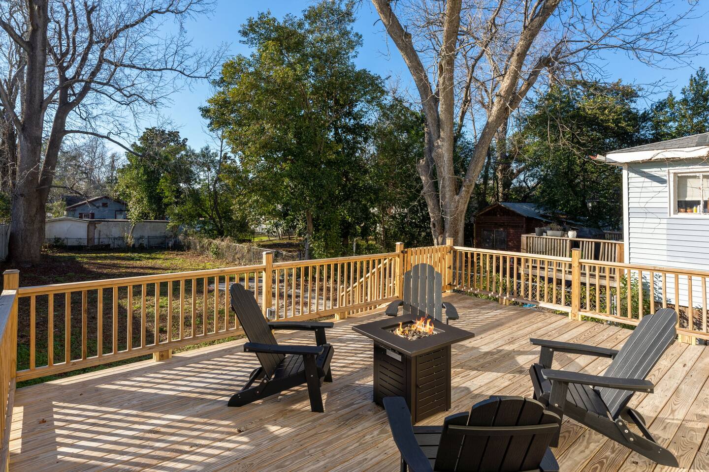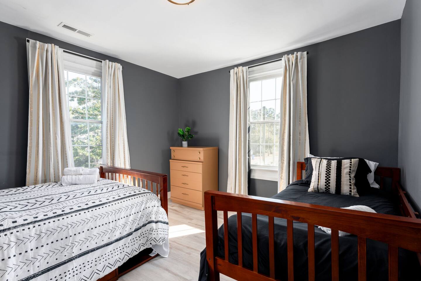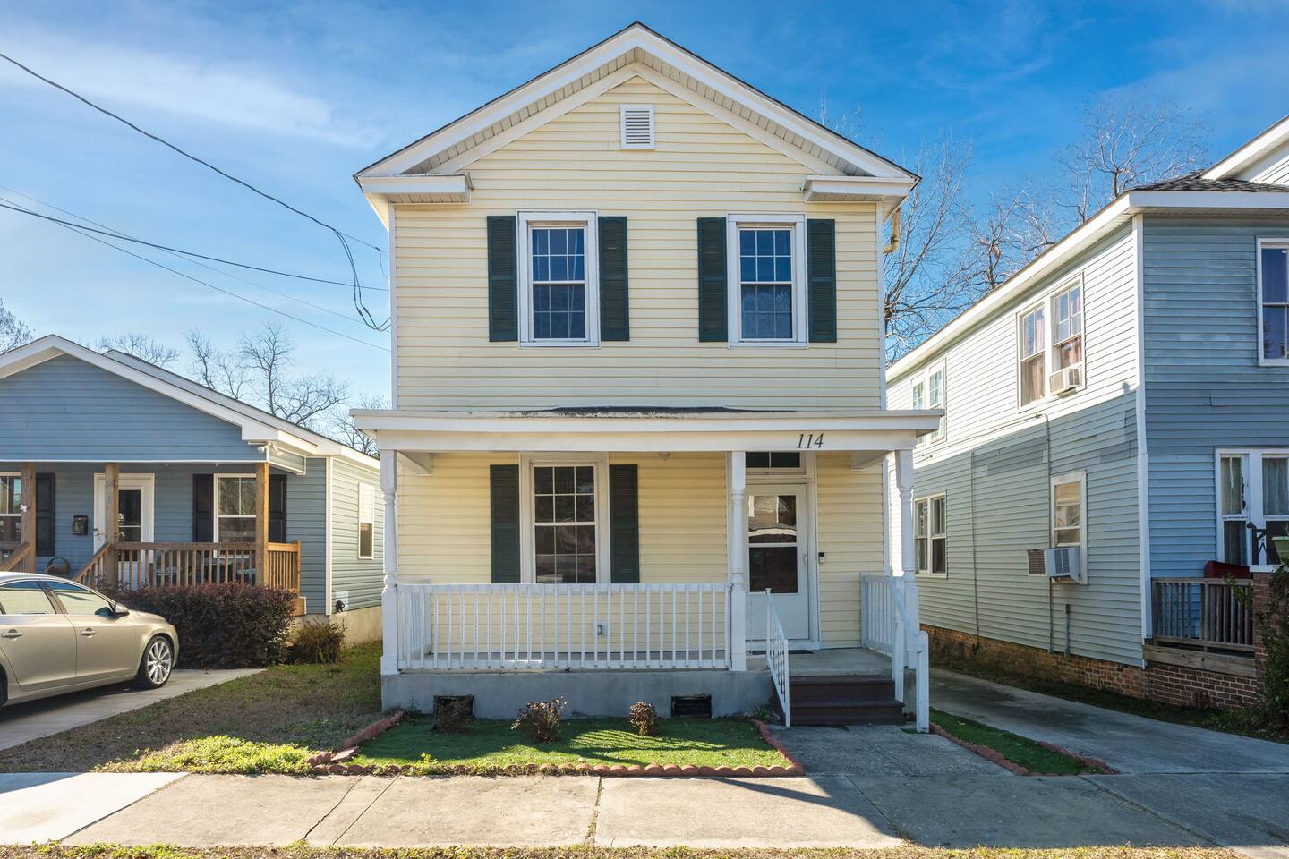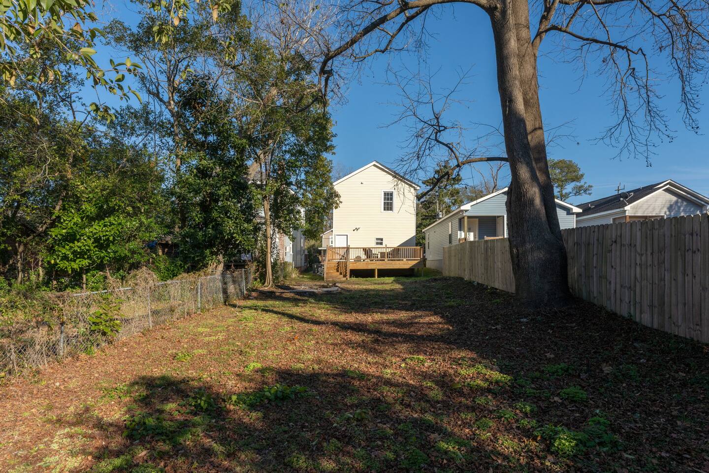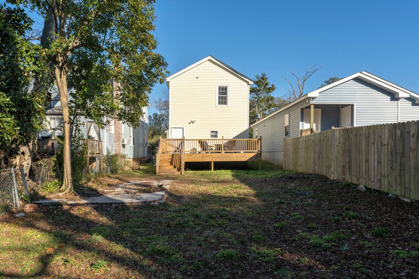 ☆☆ BEDROOMS ☆☆ ➝ Bedroom 1 (Primary Suite): This spacious and serene bedroom features a comfortable queen-sized bed with plush linens and a cozy duvet. Located upstairs, it offers privacy and is perfect for unwinding after a day of exploring. Ample closet space and a bedside table with reading lamps complete the room's functionality and charm. ➝ Bedroom 2: Bright and inviting, this room is furnished with two twin beds, each outfitted with soft bedding and fluffy pillows. The layout makes it ideal for children, friends, or siblings traveling together. A large window provides plenty of natural light, and a dresser ensures space for personal belongings. ➝ Bedroom 3: Perfect for a small family or a group of friends, this versatile bedroom includes a full-sized bed and an additional twin bed. Both beds are adorned with high-quality linens, making it a cozy space for relaxation. The room also features a bedside table, reading lamp, and a closet for convenience. ☆☆ BATHROOMS ☆☆ ➝ Bathroom 1 (Ensuite in Bedroom 1): This private ensuite bathroom, located within the primary bedroom, features a relaxing tub/shower combination, making it perfect for a soothing soak or a quick rinse. Elegant tile work and bright lighting create a serene atmosphere, while the spacious vanity provides ample room for your toiletries. Complimentary essentials such as shampoo, conditioner, body wash, and fresh towels are included to make your stay comfortable and convenient. ➝ Bathroom 2 (Shared Upstairs): Also located upstairs, this shared full bathroom features a tub/shower combination, ideal for guests who enjoy a relaxing bath or a refreshing shower. The bathroom is thoughtfully designed with modern fixtures, a large mirror, and a well-lit vanity with plenty of counter space. As with the ensuite, this bathroom is stocked with toiletries and fresh linens for your convenience. ☆☆ KITCHEN & LIVING ROOM ☆☆ The living room is spacious and designed for comfort, offering a perfect space to relax after a day of exploring Wilmington. Large windows let in plenty of natural light, creating a warm and inviting atmosphere. The fully equipped kitchen features dinnerware, utensils, and all cooking essentials, including pots, pans, and basic spices. Whether you’re brewing morning coffee or preparing a family feast, this space has you covered! ☆☆ OUTSIDE SPACE ☆☆ Step into your own private oasis! The backyard offers a cozy deck perfect for enjoying your morning coffee or hosting an evening by the fire. Surrounded by mature trees, the space feels peaceful and secluded despite being in the heart of Wilmington. ☆☆ HOME DISTANCE IN MILES & TIME ☆☆ This charming home is ideally located for travelers looking to explore Wilmington’s vibrant attractions and natural beauty. ➝ Wilmington Int'l Airport (ILM): 4.2 miles, approximately 10 minutes by car ➝ Downtown Wilmington: 1 mile, approximately 5 minutes by car or 15 minutes on foot ➝ Live Oak Bank Pavilion: 1.2 miles, approximately 5 minutes by car or 20 minutes on foot ➝ Wrightsville Beach: 10.9 miles, approximately 20 minutes by car ➝ Wilmington Convention Center: 1.5 miles, approximately 5 minutes by car or 20 minutes on foot ➝ Battleship North Carolina: 3.2 miles, approximately 10 minutes by car ➝ Cargo District: 0.8 miles, approximately 3 minutes by car or 10 minutes on foot